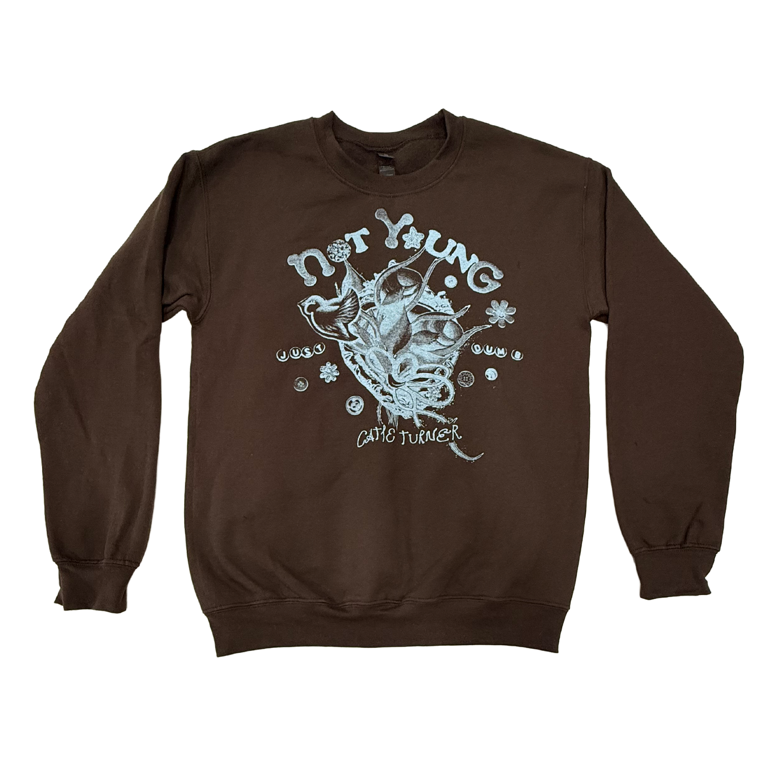 Brown heavy blend crewneck with baby blue screenprint. Based on the "Not Young, Just Dumb" song and cover art. Ideal for people who swear they can handle their liquor until they absolutely cannot and their friends have to turn into babysitters.