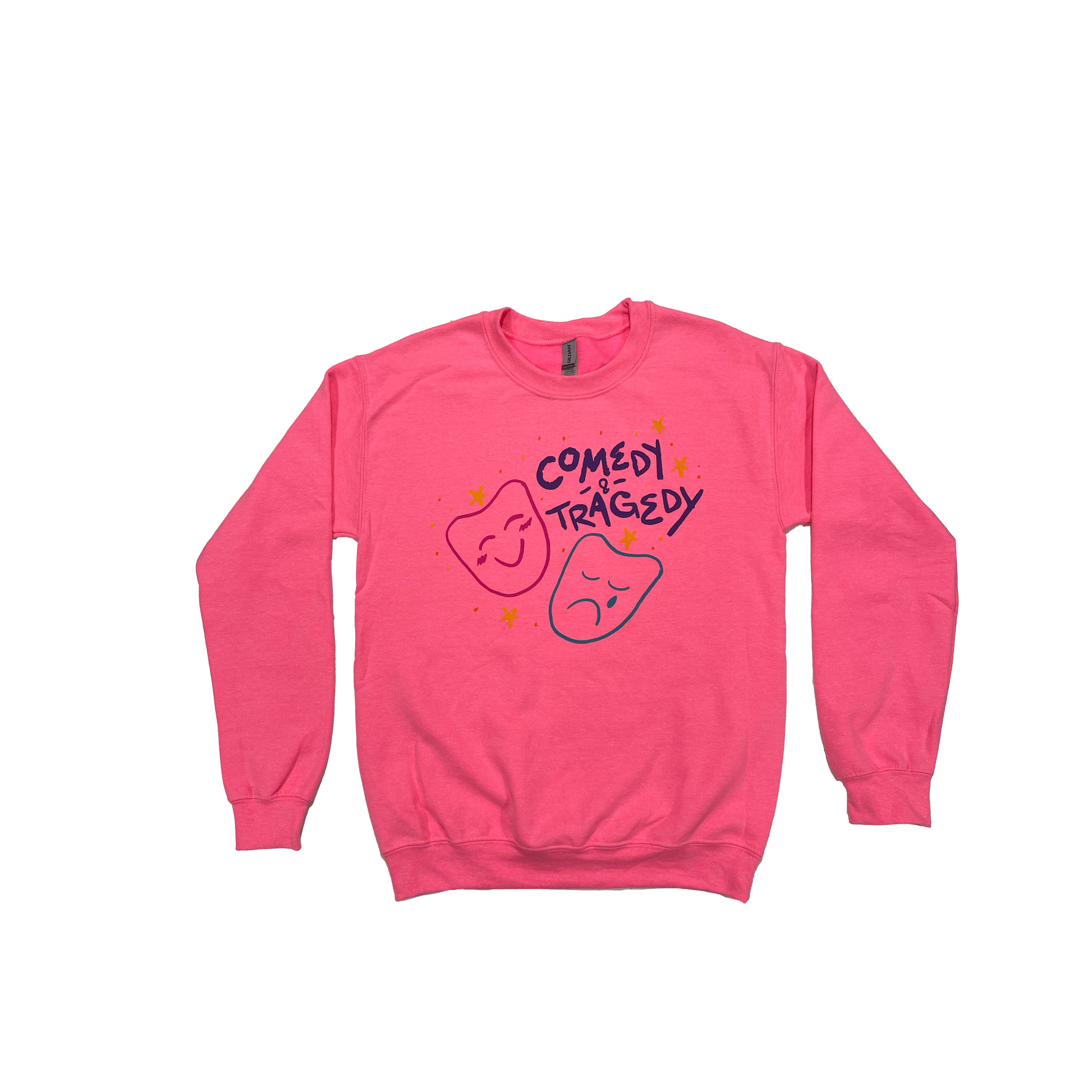 Pink crew with "Comedy & Tragedy" and doodled theater masks and stars. For people who like to crack a joke instead of processing their feelings.