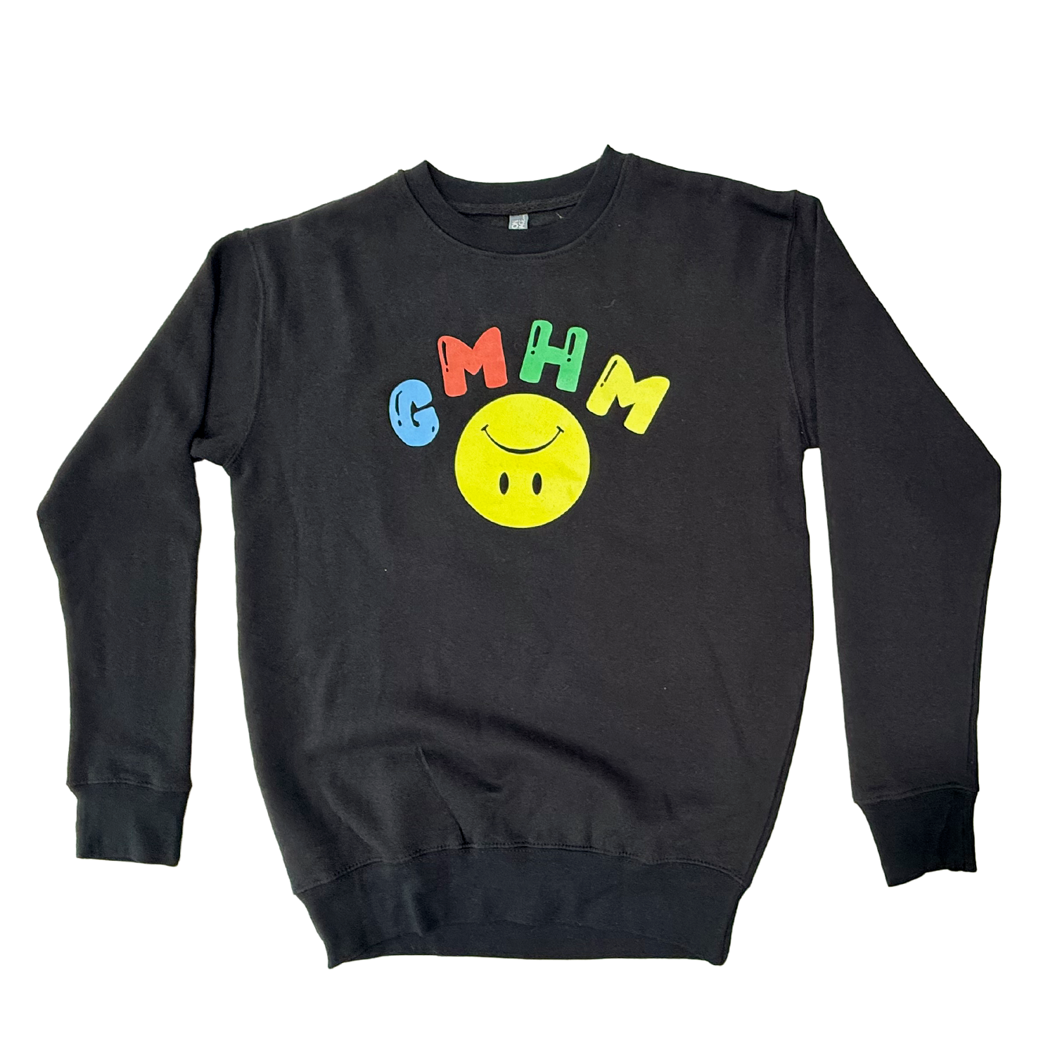 Long-sleeve GMHM (God Must Hate Me) Crew in black. "GMHM" in bright rainbow bubble letters with an upside down frowny face. Cozy enough to make you forget that you forgot to love your own body today.
