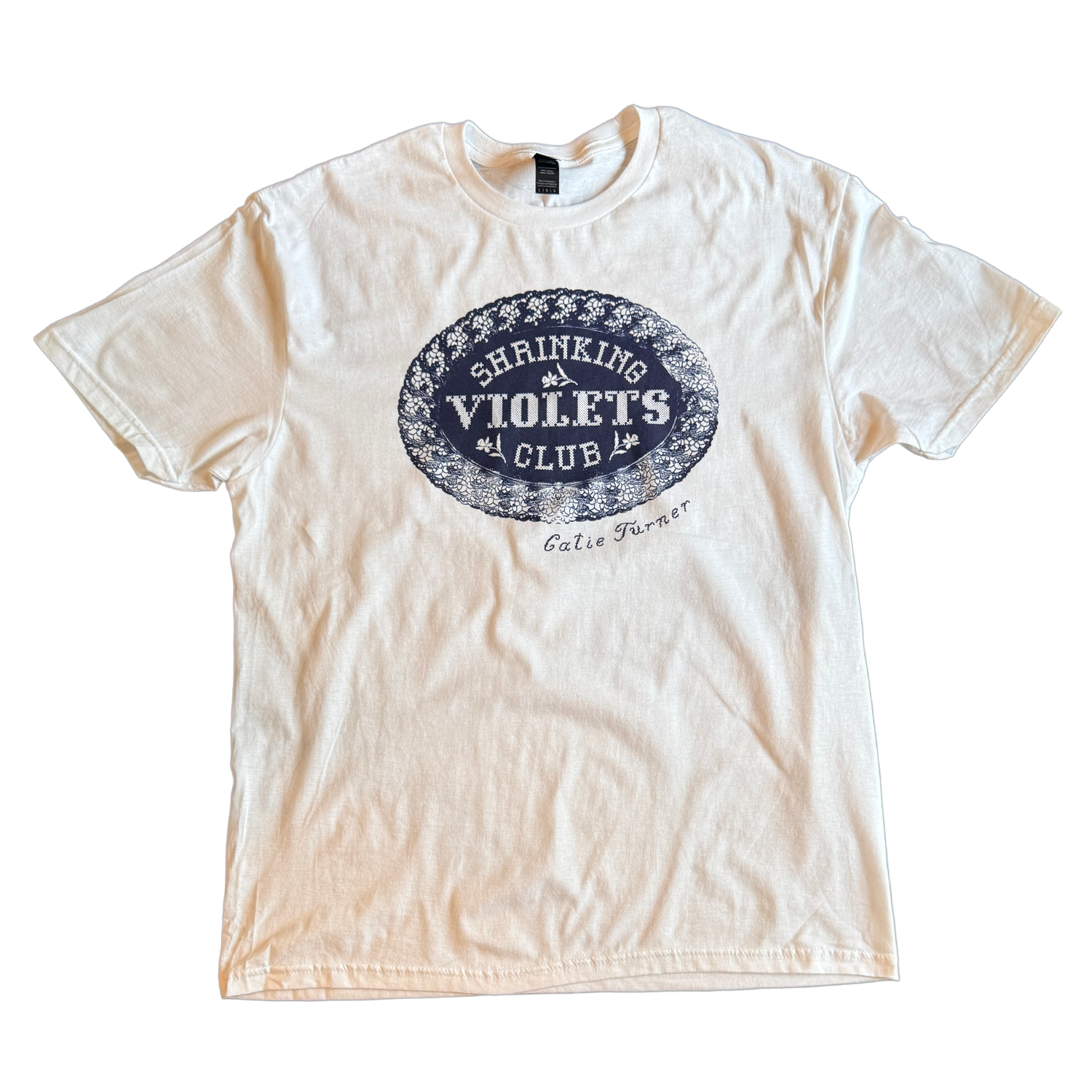 White tee with "SHRINKING VIOLETS CLUB" navy print on a lace-style background with flowers and "Catie Turner" below.